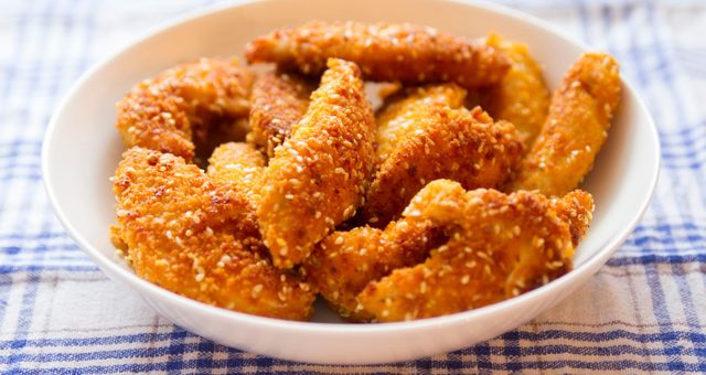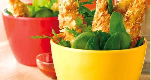 25min Facile De fines lamelles de poulet panées aux amandes accompagnées de jeunes pousses d’épinards. Une recette qui plaira à vos enfants, ils adoreront plonger les aiguillettes panées dans la sauce Fruity Thaï. Ingrédients...